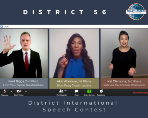 - First Place: Akili Atkinson, Blue Frog Toastmasters