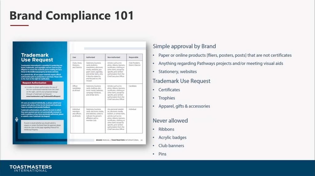 “Toastmasters Branding with Jessica Mobeck” is a complement to the D56 Messenger article by Stacey Butler, Social Media Chair (October edition). Jessica is the Marketing Project Coordinator for Toastmasters International and the organization’s brand specialist. Vice president public relations, club officers and/or members who create Toastmasters posters, flyers, manage club websites, and post on social media platforms will understand the importance of brand compliance after listening to Jessica’s succinct explanations in this recording. This video was contributed by the D56 Public Relations Team.