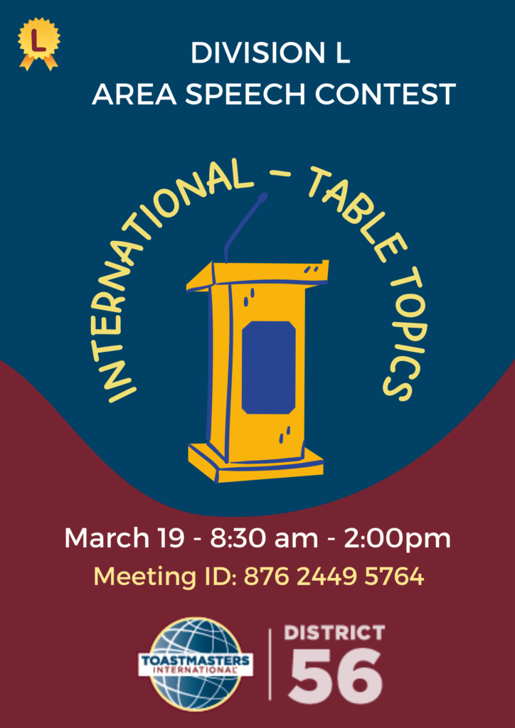 Division L Director Avishek Chowdhury, DTM, invites you to the Spring 2022 Division L Area Speech Contest. See details below: Speech: International & Table Topics Saturday, March 19, 8:30 am – 2:00 pm Zoom Meeting ID: 876 2449 5764 https://us02web.zoom.us/meeting/register/tZMrde2spz4tHNBMz8KNhTWwhV0nBoVqusKF Please feel free to join us and support the contestants!