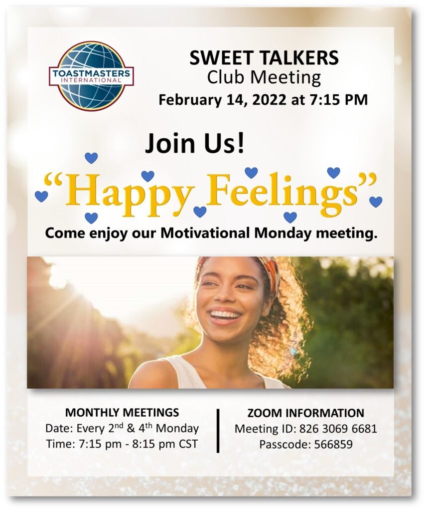 Join Sweet Talkers Motivational Monday meeting “Happy Feelings” Tonight 7:15 PM