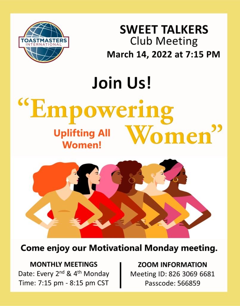 Join Sweet Talkers Club Meeting | March 14, 2022 | “Empowering Women” Uplifting All Women! ” Motivational Monday