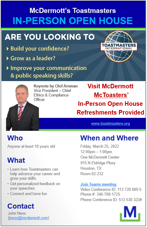 If you want to improve your public speaking skills, grow as a leader, and connect with other professionals, come check out our open house on Friday, March 25, from 12-1PM. You’ll get personalized, constructive feedback on your speeches, have numerous chances to speak, and have some fun. Our club is open to anyone at least […]
