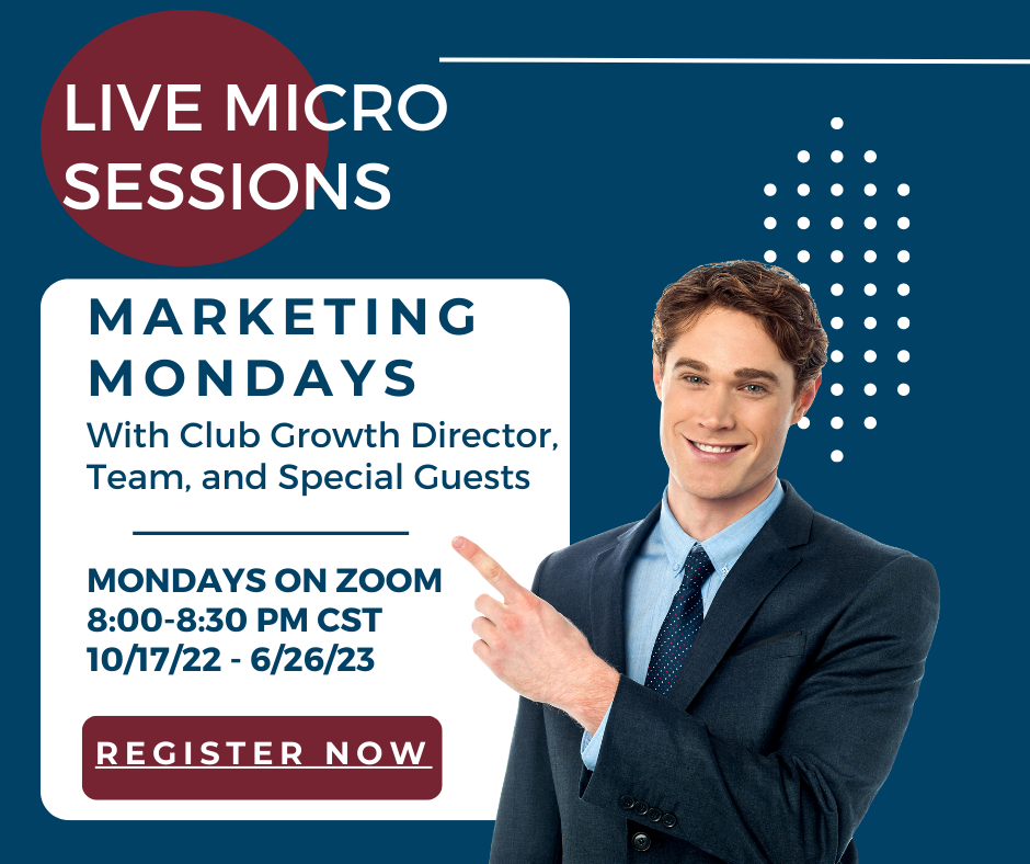Each Monday, the District 56 Club Growth Director and Team facilitate a different micro-marketing session to help Toastmasters clubs increase attendance, retain members, and build membership. Register now!