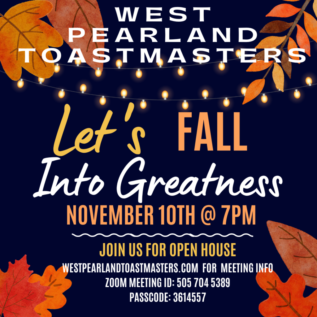 Everyone’s invited, and all are welcome! Please join West Pearland Toastmasters for an Open House on November 10 at 7:00 PM. Log on a bit early (6:45 PM is recommended) to be sure you’re able to connect, do a mic and speaker check, and get ready for fun and learning.